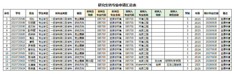 根据《伟德源自英国1946研究生学籍管理办法》(长大校发〔2020〕92号)、《关于<伟德源自英国1946研究生学籍管理办法>转专业有关条款的补充解释》(研院发〔2024〕5 号)等文件中关于转专业的相关规定,按照工作进程,经学生申请,导师同意,学院审核,现将2025-2026学年第一学期转专业审核结果公示如下,公示时间:2025年9月19日至2025年9月23日。如有异议,请与教学办联系02769111182曾老师。 资源与环境学院 2025.9.19