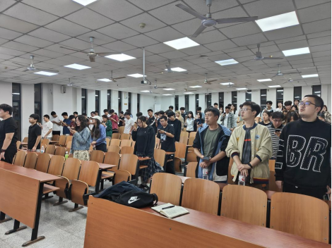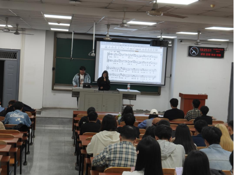 活动伊始,黄鹏老师指出,校歌是学校精神文化的生动载体,希望研究生同学们在科研探索之余,也能在歌声中加深对学校历史与底蕴的理解,凝聚奋进力量。教学环节由两位本科同学领衔,他们采用“一句一跟唱”的互动模式,耐心示范每一句的旋律与节奏。经过数轮反复练习,同学们的演唱从最初的参差不齐逐渐变得整齐划一,歌声也愈发自信洪亮。整个教室沉浸在激昂的旋律中,校歌所承载的精神内涵在声声传唱中深入每一位学子的内心。