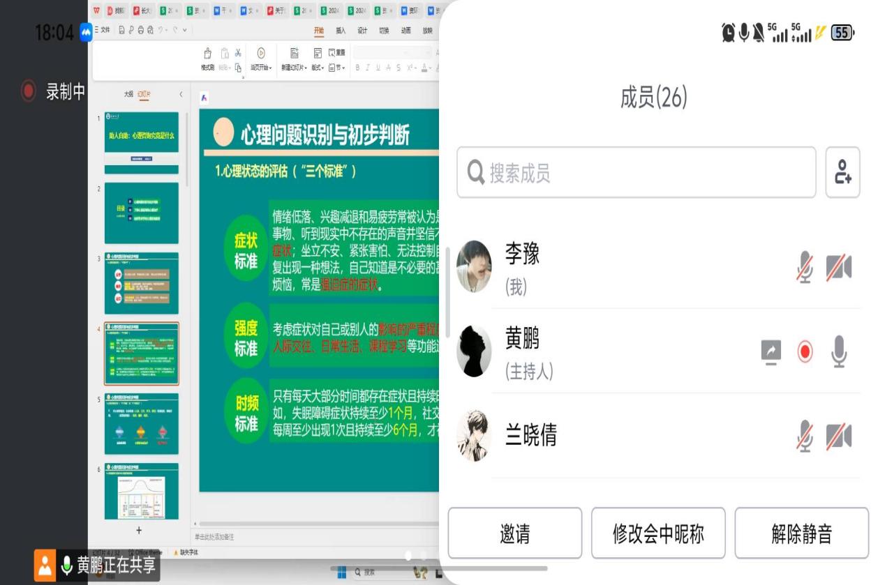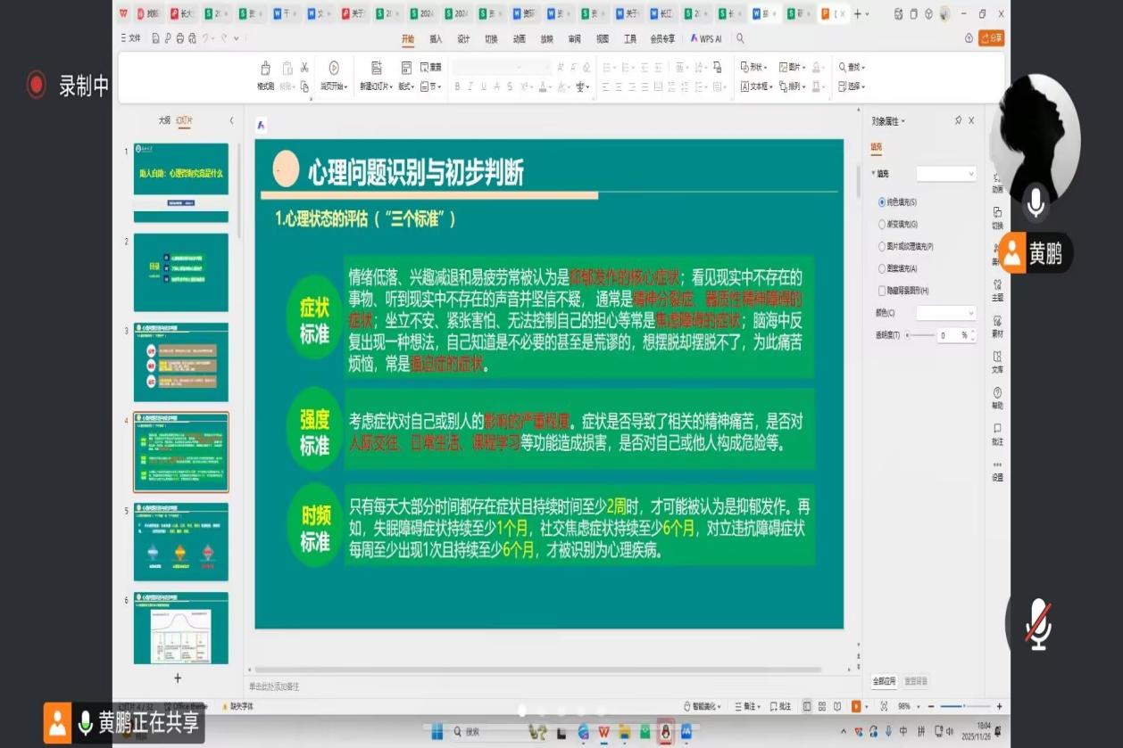 (通讯员 李豫 图/文)为帮助25级新生心育骨干精准识别心理问题、掌握心理咨询核心知识,筑牢校园心理健康防线,11月25日19:00,伟的国际1946bv采用“线下+线上”双线并行模式,同步举办25级新生心育骨干专题培训。本次培训以“助人自助:心理咨询究竟是什么”为核心主题,本科生专场在荆州校区线下开展,面向25级本科新生心育骨干;研究生专场通过线上会议平台同步推进,覆盖25级研究生心育骨干,辅导员郭政、黄鹏分别担任本研专场主讲人。 本科新生专场中,郭政老师聚焦本科生校园适应、学业压力、人际交往等高频心理困扰,展开针对性授课。他以“三把尺子”“三个标准”为核心,结合具体案例拆解抑郁、焦虑、社交恐惧等常见心理问题的典型表现,指导骨干们从情感、生理、行为维度快速识别身边同学的心理困扰。同时,郭政老师详细澄清了“心理咨询就是聊天”“只有患病才需咨询”等认知误区,演示了“今日校园”APP心理咨询预约流程,强调了咨询基本设置与保密原则,并通过互动模拟让骨干们体验简单的情绪疏导技巧,强化实操应用能力。现场骨干们专注记录要点,积极参与互动,学习氛围浓厚。 研究生专场在线上同步进行,黄鹏老师围绕研究生阶段科研压力、学术焦虑、职业规划等核心议题,系统讲解了心理咨询与心理治疗的区别、精神科诊疗与心理咨询的协同关系。他通过表格清晰呈现社会工作者、心理咨询师、精神科医师的职业分工,以“溺水者比喻”生动阐释心理咨询师的角色定位,并针对研究生可能面临的长期科研压力、学术挫折、人际关系淡化等问题,分享了心理支持的有效路径与沟通技巧。 线上互动环节,骨干们围绕“科研瓶颈期的情绪调节”“学术团队人际磨合”“如何引导同学正确看待心理治疗”等问题踊跃提问,黄鹏老师结合专业知识与实际案例逐一细致解答,现场氛围热烈。 培训尾声,郭政老师在线下主会场、黄鹏老师在线上分别作总结。两位老师均强调,心育骨干是校园心理健康防护网的关键力量,肩负着关注同学心理状态、传递心理支持的重要责任。希望全体骨干将本次培训所学知识转化为实际行动,精准识别身边同学的心理需求,主动提供力所能及的帮助,同时熟练运用校园心理服务资源,引导有需要的同学科学求助。此次双线培训兼顾本研新生的心理发展特点,构建了差异化、系统化的知识体系,