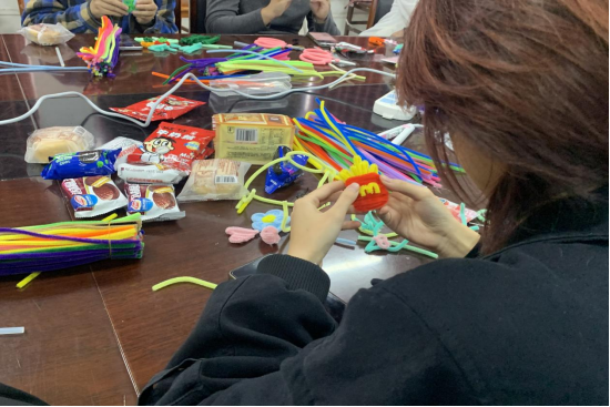 16时整,活动正式启动。工作人员开场阐释活动“以手作疗愈心灵”的核心意义,打破大家对创作需专业基础的顾虑,鼓励全体参与者放松心态、大胆发挥创意。随后,工作人员现场演示扭扭棒弯曲、缠绕、拼接、固定等基础创作技巧,展示花朵、小兔子、爱心摆件等多款简易成品提供灵感,同时细致讲解剪刀、胶水等工具的安全使用规范,为活动有序开展筑牢基础。