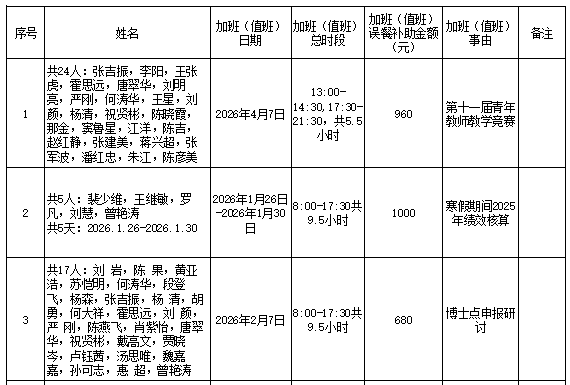 根据《伟德源自英国1946加班(值班)误餐补助管理办法(试行)》(长大校发【2019】83号)文件规定,现对资环学院加班(值班)误餐情况(2026年1月26日-2024年4月17日之间的青教赛/博士点申报)进行公示,如果对加班(值班)误餐情况有异议,可以通过电话或电子邮件等方式向资环学院办公室反映。